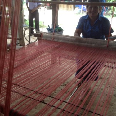 - ขั้นตอนการทอ เมื่อจัดเตรียมอุปกรณ์ทุกอย่างเรียบร้อย นำหลอดที่กรอเตรียมไว้มาใส่กระสวย(ขั้นตอนนี้ต้องระวังอย่าสลับหลอดเป็นอันขาด) การทอจะต้องส่งกระสวยผ่านเส้นยืนไปมาในขณะที่เท้าของผู้ทอก็เยียบคันยกเขาสลับไปมาเพื่อให้เส้นยืนยกขึ้นลง เป็นช่องพอดีจะให้กระสวยเดินผ่านได้ เมื่อทอได้ความยาวพอประมาณจะสังเกตเห็นขอบผ้าทั้งสองด้านห่อหรือย่นเข้าหากันให้นำไม้สะดึงมาตึงด้านล่างโดยปลายไม้สะดึงจะมีเดือยแหลมทั้งสองด้านและมีความยาวกว่าหน้ากว้างของผ้า นำไม้สะดึงมาเสียบขอบผ้าด้านล่างทั้งสองด้าน โดยห่างจากหน้าผ้าที่กำลังทอ ประมาณ 1 เซนติเมตร ไม้สะดึงเมื่อเสียบเสร็จจะมีลักษณะโค้งลงด้านล่างและจำทำให้ขอบผ้าตึงออกด้านข้าง ในขณะที่ทอนาน ๆ จะทำให้ความยาวของผืนผ้าเพิ่มขึ้น ผู้ทอต้องเอื้อมไกลทอลำบาก ขั้นตอนนี้ ผู้ทอต้องคลายเส้นยืนและม้วนผ้าที่ทอเสร็จแล้วใส่ไม้กำพัน ให้เหลือปลายไว้พอประมาณ จากนั้นใส่สลักไม้กำพัน ให้แน่นแล้วตึงเส้นยืน และหวีเส้นยืนเพื่อจัดเส้นด้ายเส้นยืน ซึ่งขั้นตอนนี้จะดำเนินการไปจนเกือบเสร็จ เมื่อเส้นยืนใกล้จะหมด ปลายเส้นยืนที่เรารอบไว้ตึง ให้นำไม้มาสอดเพื่อเส้นยืนออกจากกันและหวีจัดระเบียบเส้นยืนแล้วดำเนินการทอจนเหลือเส้นยืนสั้นที่สุดตัดผ้าที่ทอเสร็จออกจากชุดเขา โดยเหลือปลายผ้าไว้ติดกับฟืมประมาณ 4-5 เซนติเมตร เป็นอันเสร็จขั้นตอนการทอ