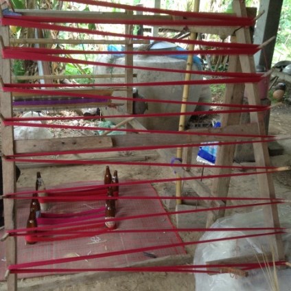 - การทำเส้นยืน นำด้ายที่เราต้องการมาใส่กงแล้วกรอใส่กระอัก ความมากน้อยอยู่ทีดุลพินิจของผู้กรอซึ่งในแต่ละครั้งอาจใช้ทีละหลายกระอัก เมื่อได้ตามจำนวนที่ต้องการแล้ว นำมาจัดเรียงเพื่อจะได้นำเส้นด้ายจากระอัก มาค้นใส่หลักเฝือ(การค้น คือ การนำเส้นด้ายคลองเวียนไปมาระหว่างสลักของเฝือ จากล่างขึ้นบนและจากบนลงล่าง)ให้จำนวนพอที่จะนำมาเป็นเส้นยืน ความกว้างเท่ากับหมี่ที่เรามัดไว้โดยนับจำนวนเส้นให้พอดีหรือน้อยกว่าฟันฟืม ถ้าหากน้อยจะทำให้ผ้าที่ทอเสร็จมีหน้าตัดแคบ หากมีจำนวนมากจะล้นจากร่องฟืมซึ่งเกินความจำเป็น เมื่อทำเสร็จแล้วใช้เชือกสอดหัวท้ายเส้นยืนที่เกี่ยวกับสลักปลายสุดจะง่ายต้องการแยกเส้นด้ายหากเส้นยืนมีหลายสีเมื่อนำมาสืบจะสามารถแยกสีได้เท่ากัน นำเส้นยืนที่ค้นเสร็จแล้วมาสืบใส่เขา(เขา จะเป็นชุดที่ประกอบไปด้วยเส้นด้ายส่วนที่เหลือไว้จากการทอครั้งก่อน ฟืมที่มีเส้นด้ายร้อยผ่านร่องฟันไว้เต็มจำนวนและปลายผ้าจะอยู่อีกฟากหนึ่งของฟืม ส่วนมากจะเหลือไว้ประมาณ 4-5 เซนติเมตร)ในการสืบ ต้องสืบทีละเส้นจากขอบด้านใดด้านหนึ่งไล่ไปจนสุดอีกฟากหากเส้นยืนสลับสีต้องระวังเป็นพิเศษเพราะหากสืบจำนวนเส้นไม่เท่ากับที่เราตั้งไว้จะทำให้ลายที่อามาเพี้ยนหรือไม่สวย เมื่อสืบเสร็จให้ปลายผ้าที่อยู่ติดกับฟืมมายึดอีกข้างให้โยงผ่านโครงกี่ไปข้างหน้า แล้วย้อมกลับมาด้านบนและยึดไว้กับโครงกี่ด้านบนของคนทอ ในขั้นตอนนี้ ฟืมและเขาจะต้องนำไม้มาสอดใส่เชือกร้อยฟืมเชือกร้อยเขา ปลายไม้ทั้งด้านแขวนไว้กับโครงกี่สามรถเลื่อนไปมาได้ ในขณะเดียว เขา 1 ชุดจะมี 2 อัน ใช้เชือกผูกเขาแต่ละอันหย่อนลงด้านล่างมัดใส่ไม้เพื่อเหยียบสำหรับยกเส้นยืนขึ้นลงสลับกันในขณะทอ ก่อนทอจะต้องตึงเส้นยืนในขณะตึงก็ให้จัดเส้นยืนไปด้วยโดยหวีหรือแปลงหวีจากต้นหรือที่ติดับเขาออกไปยังปลายกี่จะทำให้เส้นยืนเรียงกันเป็นระเบียบง่ายต่อการเลื่อนเข้าไปข้างหน้า